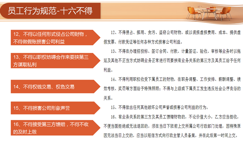 宣講環(huán)節(jié)主要從四個(gè)方面著手:分別為“目的、行為規(guī)范約定、違約責(zé)任與管理和連帶責(zé)任”。員工需要從十六方面規(guī)范自身的行為,包括不得索要和接受第三方財(cái)物、不得要求第三方報(bào)銷(xiāo)個(gè)人費(fèi)用和要求第三方借款、未經(jīng)允許不得參加第三方安排的宴請(qǐng)等等。