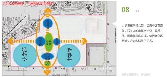 小學(xué)設(shè)在學(xué)校北部,初高中設(shè)在南部,兩者之間由教學(xué)中心,音樂廳、國際部天然分隔,使兩者分區(qū)明確,行走動線互不干擾。