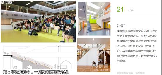 澳大利亞心理專家實(shí)驗(yàn)證明:小學(xué)生對于事物的認(rèn)識、辨別與選擇多是根據(jù)對視覺有強(qiáng)烈感染力的色彩進(jìn)行的。該校多處設(shè)立公共大臺階,運(yùn)用鮮艷色彩和材質(zhì)出充分考慮小學(xué)生心理特點(diǎn),激發(fā)學(xué)生的藝術(shù)細(xì)胞。