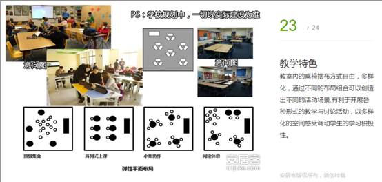 教室內(nèi)的桌椅擺布方式自由,多樣化,通過不同的布局組合可以創(chuàng)造出不同的活動場景,有利于開展各種形式的教學(xué)與討論活動,以多樣化的空間感受調(diào)動學(xué)生的學(xué)習(xí)積極性。
